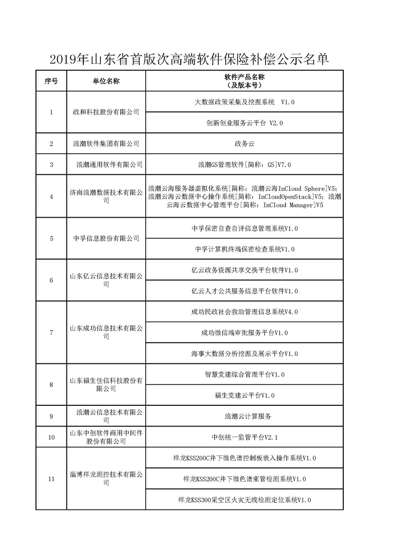 按照《关于组织开展2019年度山东省首台(套)技术装备及关键核心零部件、新材料首批次应用、首版次高端软件保险补偿申报工作的通知》(鲁工信装〔2019〕136号)要求,省工业和信息化厅组织专家,对各市推荐的首版次高端软件保险补偿申报材料进行了评审,现将通过审核的名单(见附件)予以公示,公示期为5个工作日。公示期间,如对公示对象有异议,请及时向省工业和信息化厅反映。